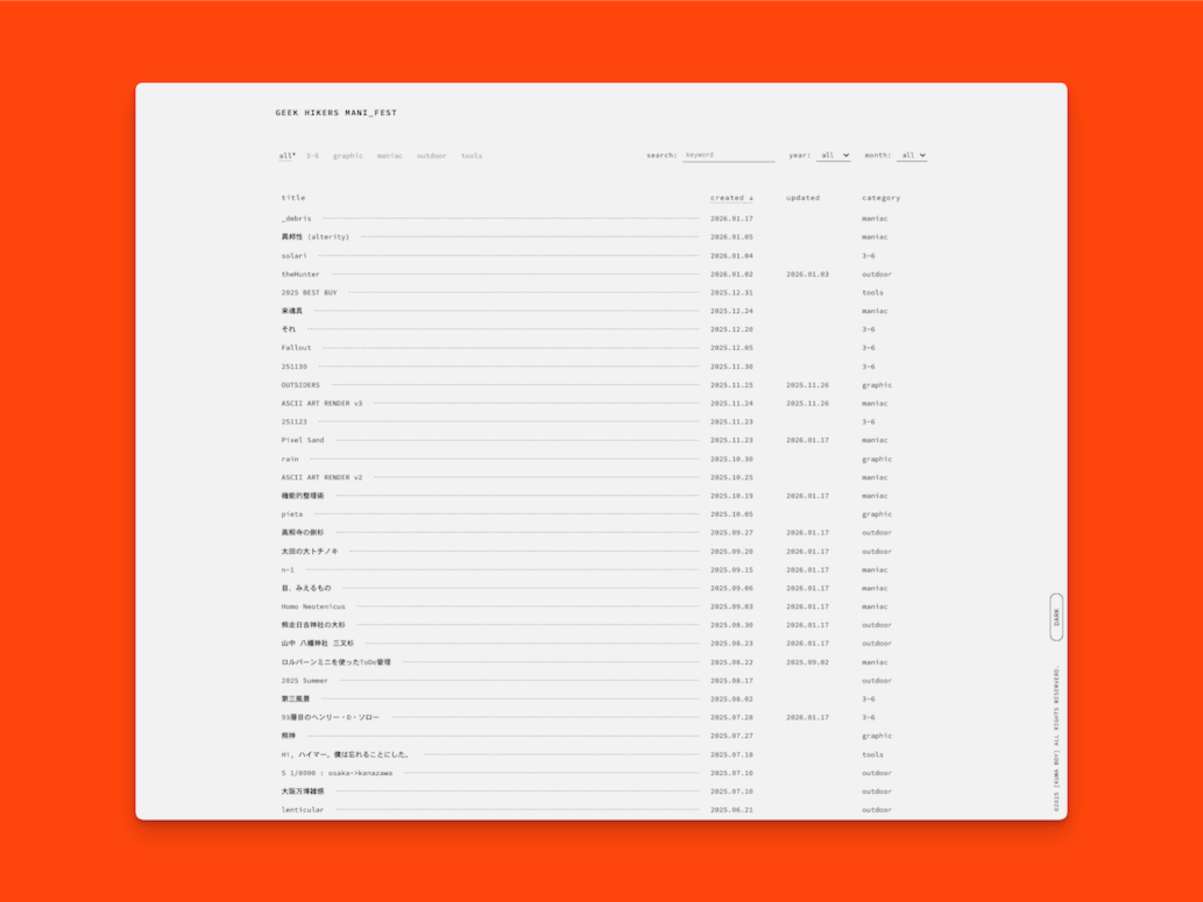 本サイトにアクセスするとまず分かるように、サイトのTOPページについてデザインを一新し、記事ページについても細かく手を入れた。前回サイトのデザインを一新したのは(記憶が正しければ)2020年とかだった気がするから、5年は変えずに使っていたことになる。気に入っていたからこそ5年もの期間、大きく変えずに使っていたわけだけど、_debrisを作ったことにも現れているように、個人Webサイトに対する考え方の変化があった。