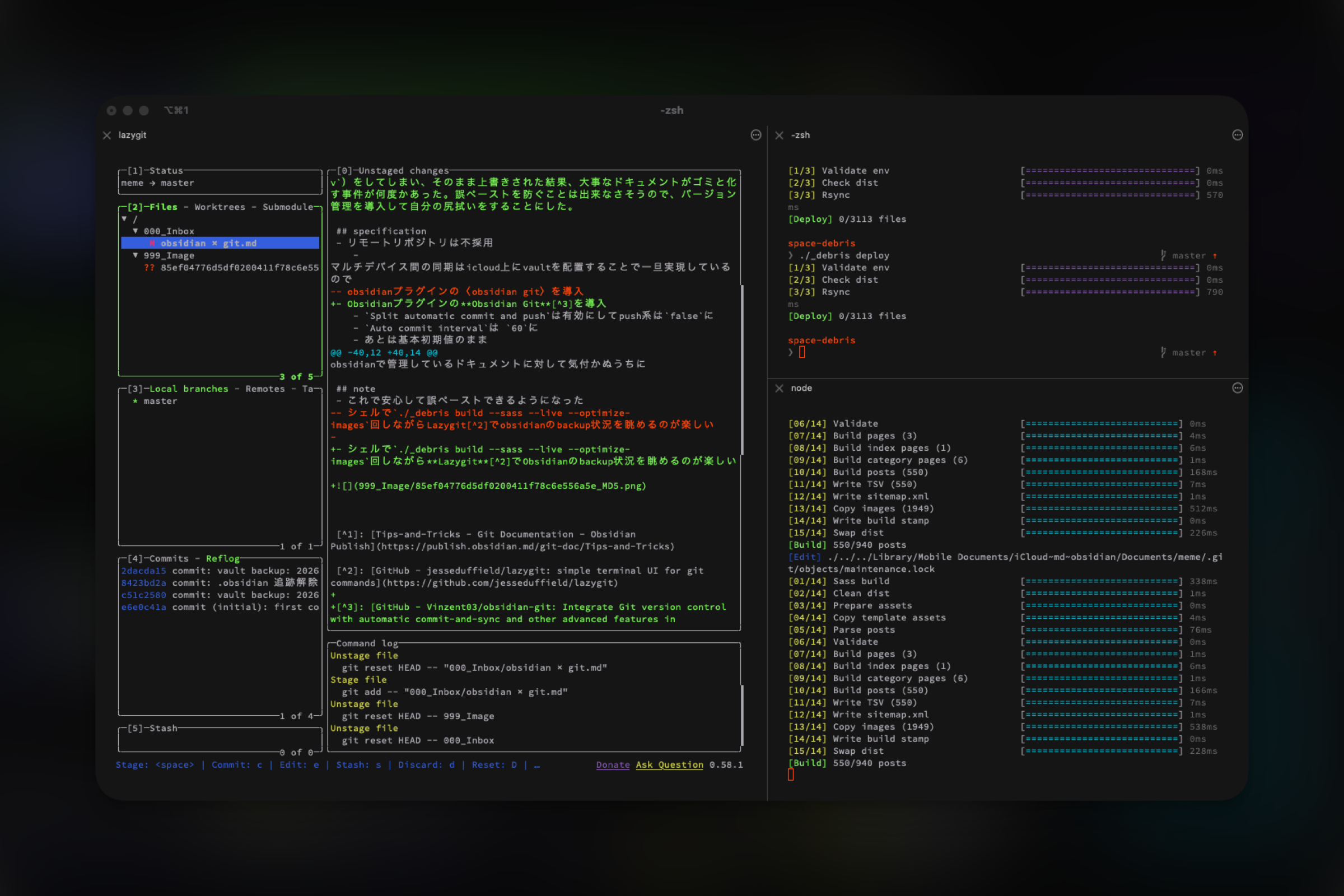 ./_debris build --sass --live --optimize-images回しながらLazygit2でObsidianのbackup状況を眺めるのが楽しい