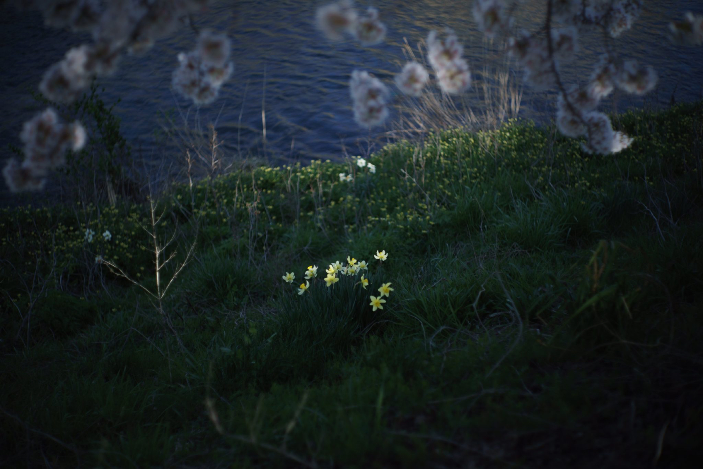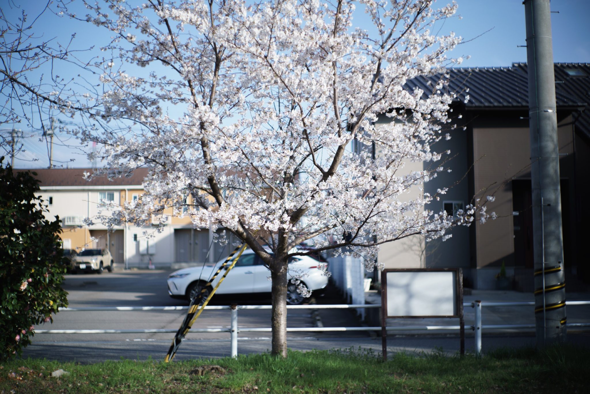 / 2023.04.01 / outdoor / washing a car on a rainy day. 車を洗う。雨が降る。桜が咲く。散る。雨が降る。車を洗う。光の粒がフロントガラスの上を滑っていく。